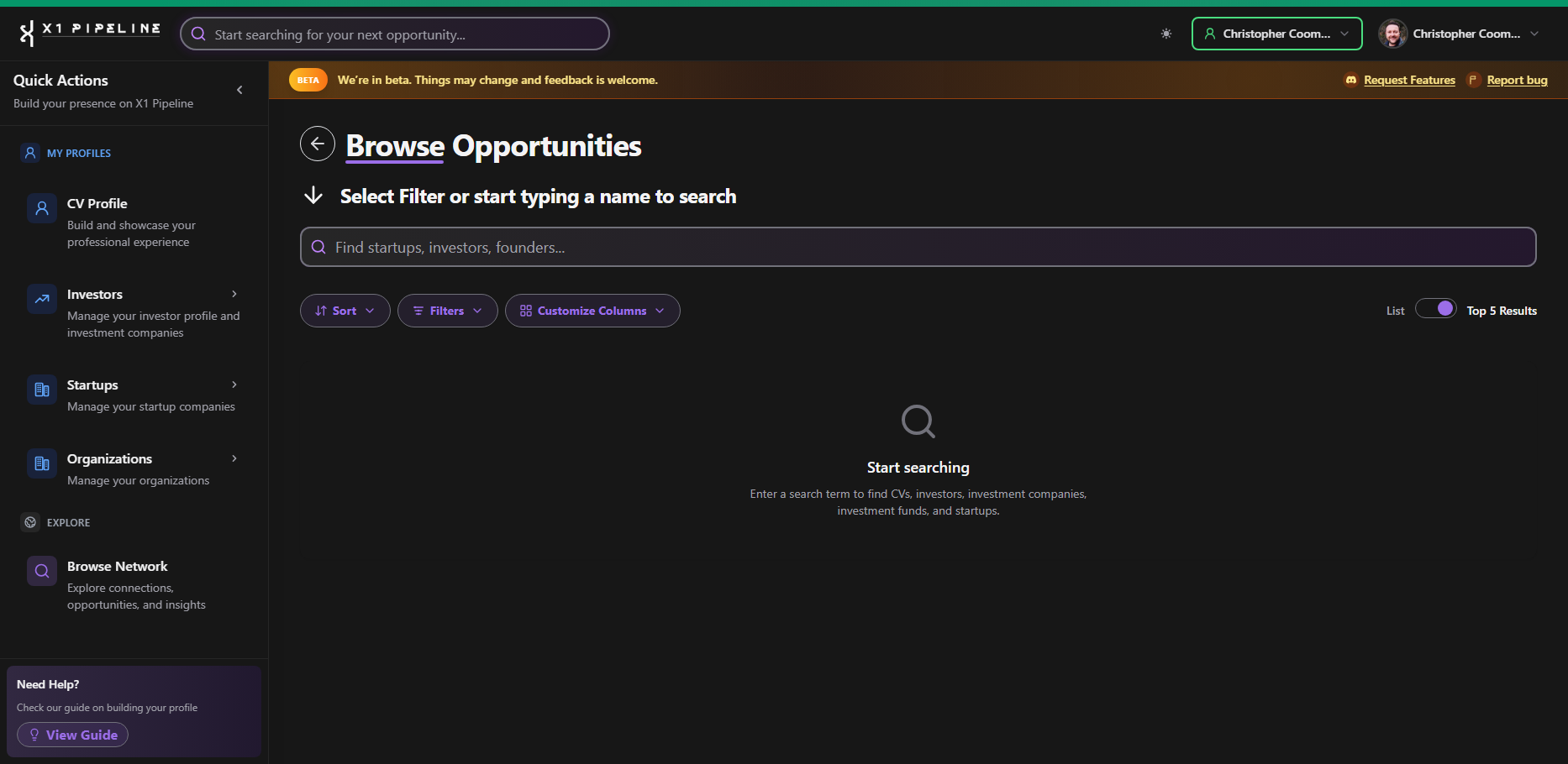 Find innovators, startups, investors, investment companies, investment funds, and organizations on X1 Pipeline with advanced filters. No database paywalls. No silos on sites. Everyone can find everyone on X1 for free.